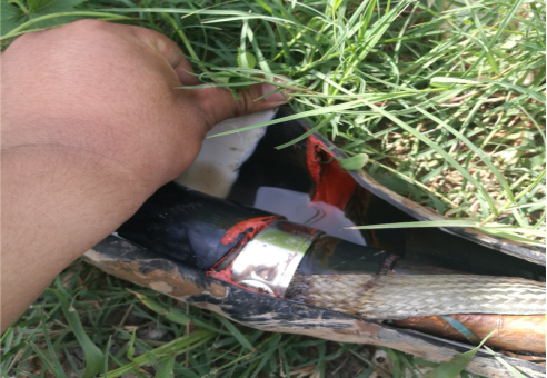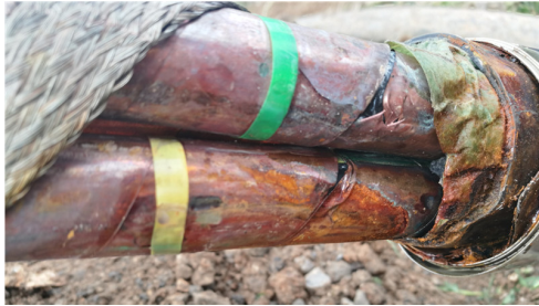 周期放電去聲磁定位,剛開始還能聽(tīng)到聲音,在精確定位時(shí)發(fā)現(xiàn)聽(tīng)不到聲音了,判斷為故障點(diǎn)燒穿,成為低阻故障,所以聲音減小,現(xiàn)場(chǎng)人員告知此處有一接頭,停止放電挖出接頭后發(fā)現(xiàn)接頭外觀完好,反復(fù)搖晃電纜接頭,繼續(xù)打壓,在接頭處聽(tīng)到微弱放電聲,打開接頭后發(fā)現(xiàn)接頭進(jìn)水。