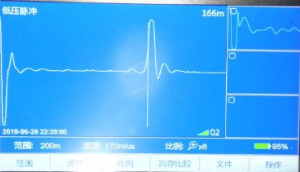 根據(jù)測(cè)試情況選擇黃地打壓,升高電壓至20KV時(shí)擊穿放電,用脈沖電流測(cè)得故障位置在144米左右。距離對(duì)端比較近。