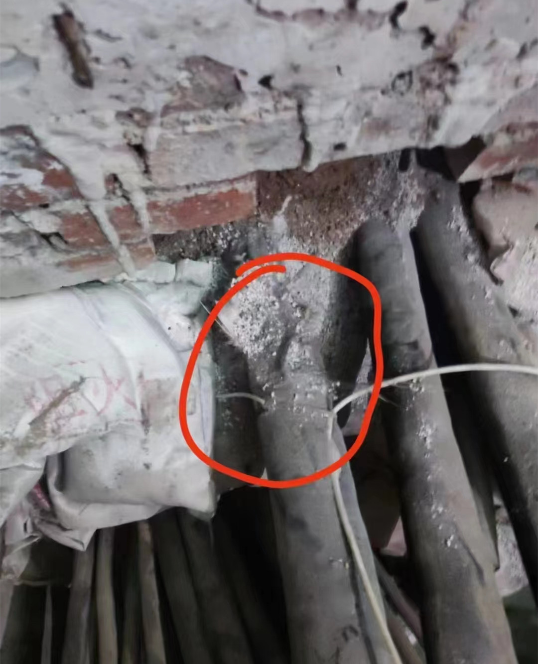 經(jīng)過查找確認在故障點兩?左右附近聽?微弱放電聲?,??在這附近開挖,挖開后發(fā)現(xiàn)有電纜破損修復的痕跡。